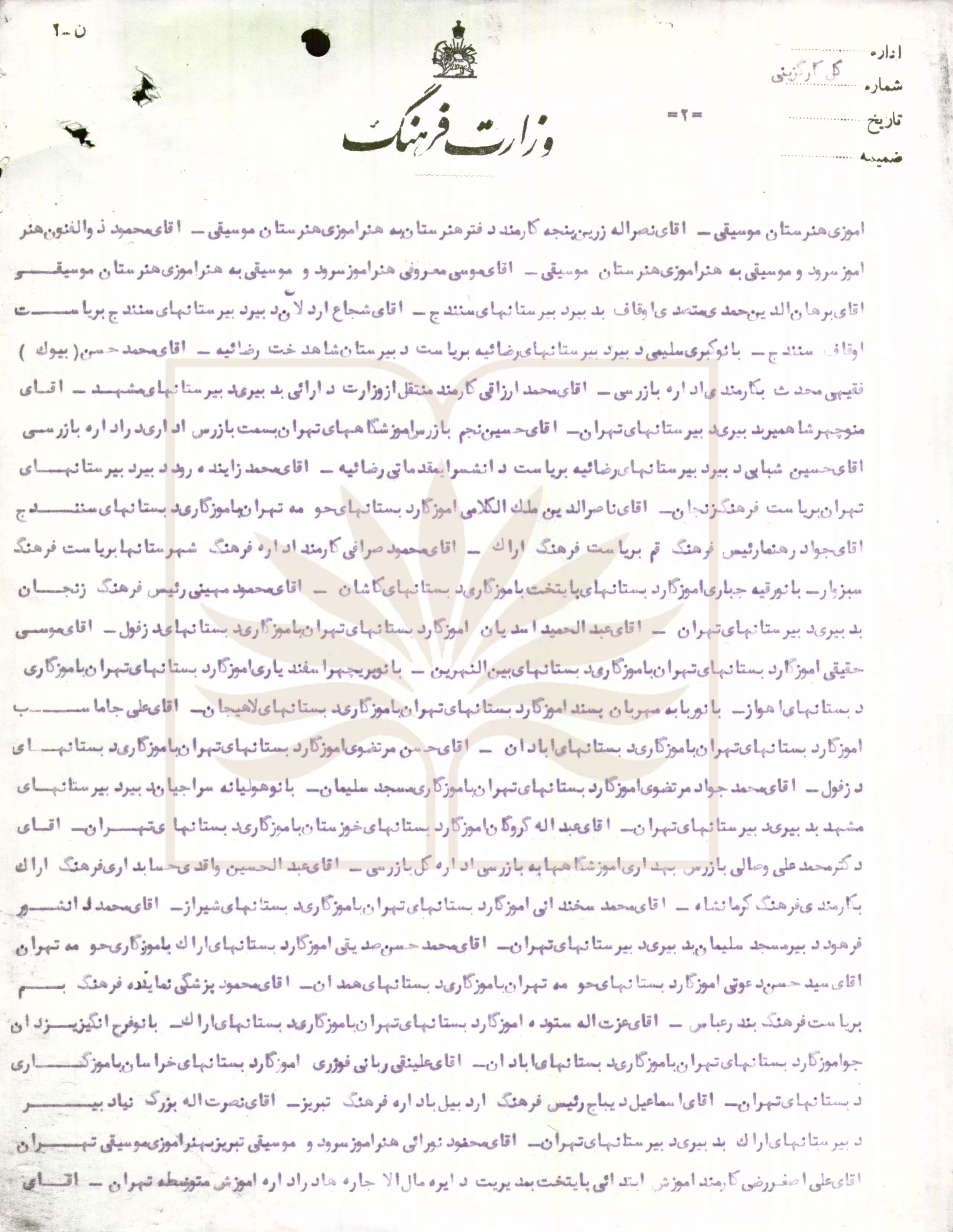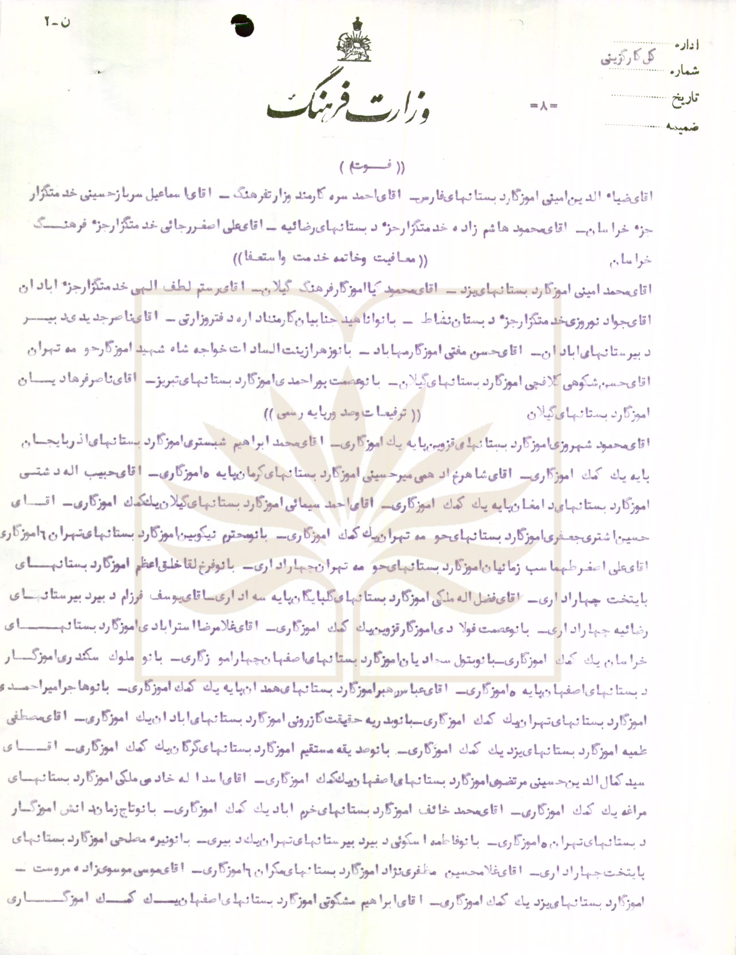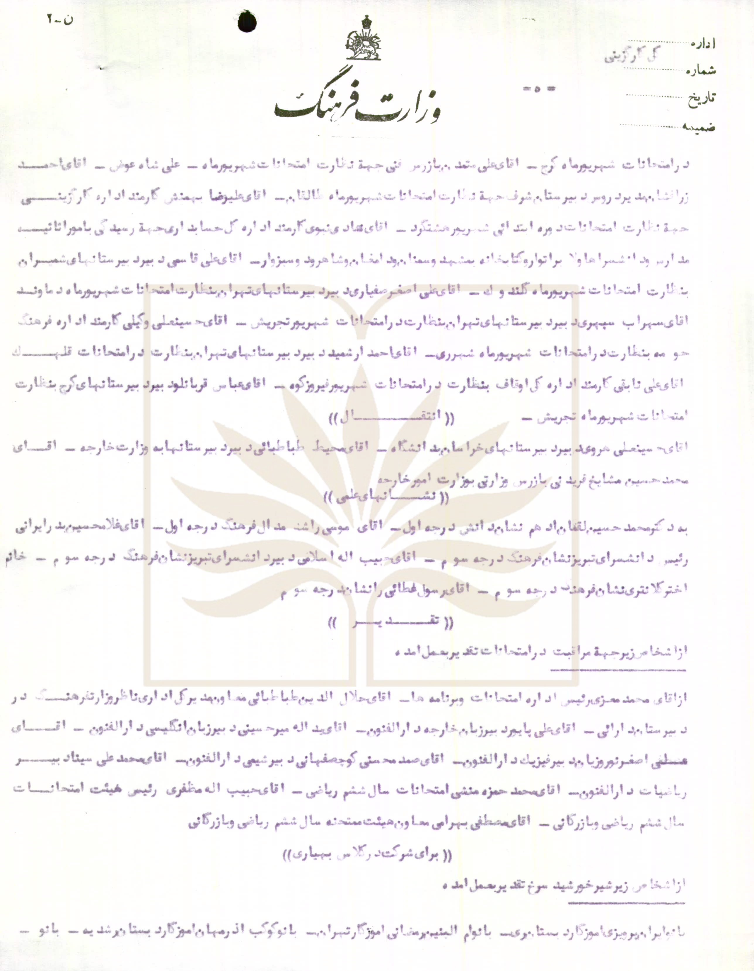 انتصاب ابوالحسن هنرآموز به عنوان كارمند هنر، حسين تهرانی و ابوالحسن صفا به هنرآموزی هنرستان موسيقی ملی، انتصاب محمود پزشكی، نماينده ی فرهنگ بم به رياست فرهنگ بندر عباس و اعطای مأموريت به افرادی مانند: علی اكبر سياسی، رئيس دانشگاه تهران برای رياست هيئت نمايندگی ايران در همانديشی يونسكو، دكتر ذبيح الله صفا، استاد دانشگاه تهران برای نمايندگی كميسون يونسكو، و انتقال افرادی چون محيط طباطبائی دبير دبيرستان ها به وزارت خارجه و اعطای نشان درجهاول در قسمت نشان به دكتر محمدحسين لقمان ادهم.