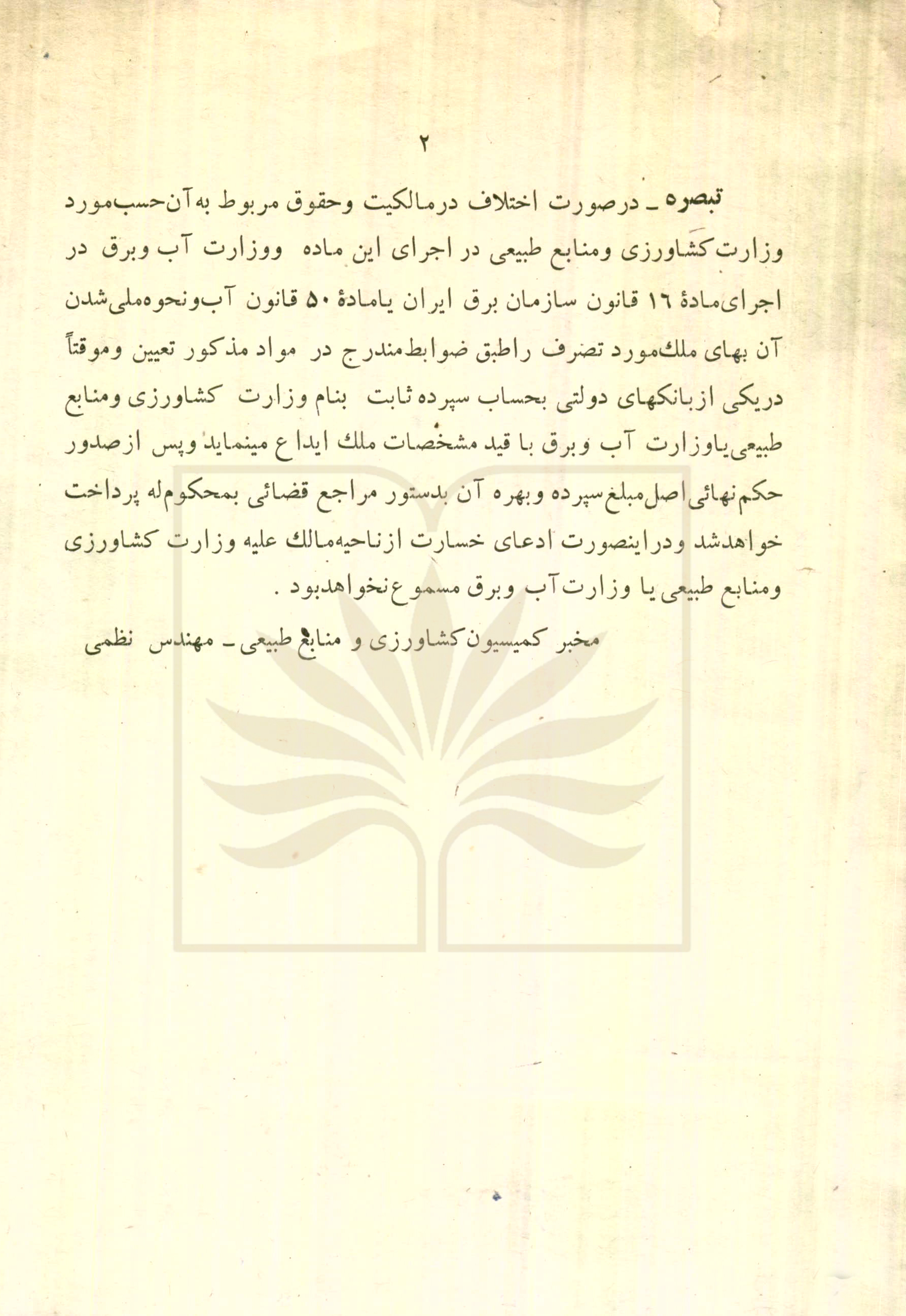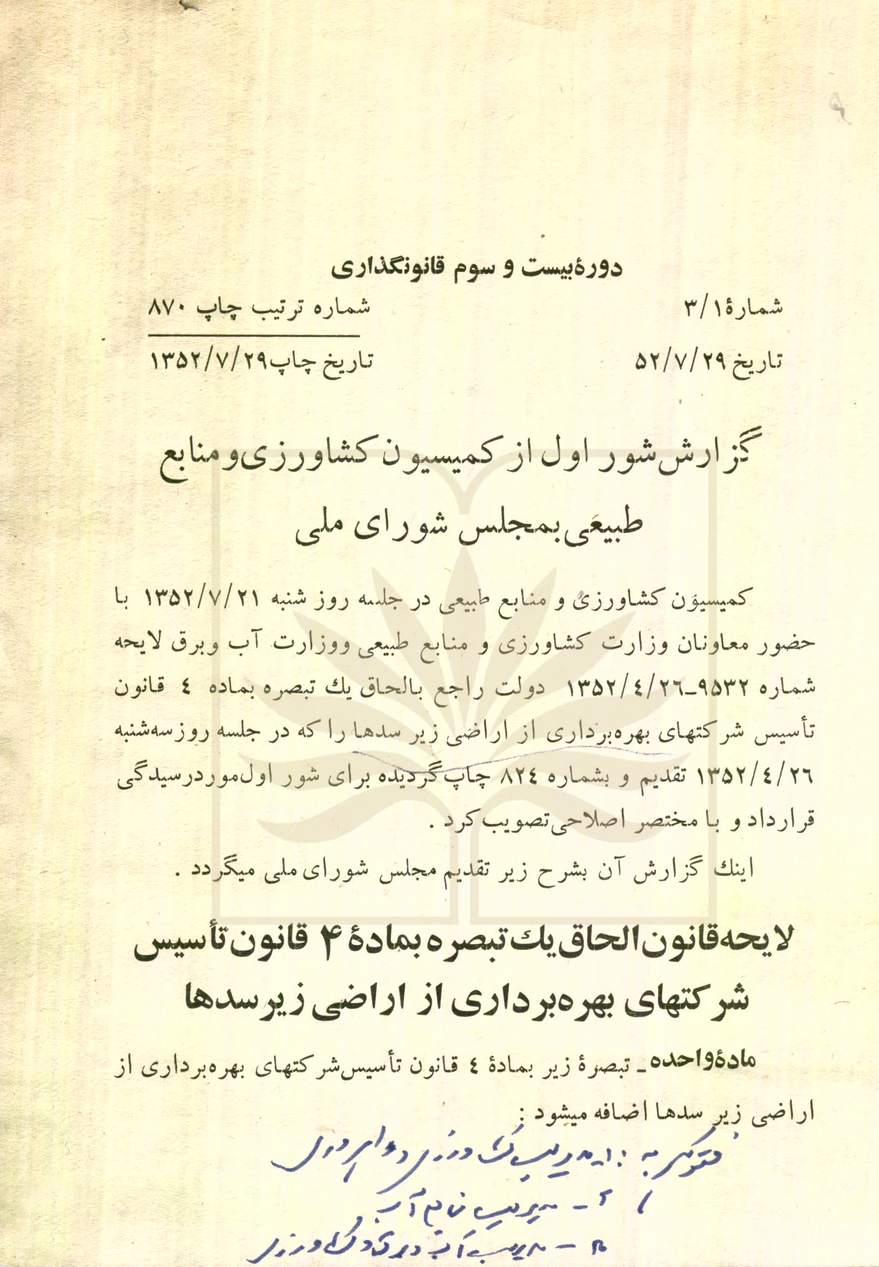 سند، حاوی گزارش شور اول از كميسيون كشاورزی و منابع طبيعی به مجلس شورای ملـی است كه در آن، در باره ی الحـاق يك تبصـره به مـاده ی4م، قـانون تأسيس شركت های بهرهبرداری از زمين های زير سدها (مصوب مجلس) با اندكی نغيير و اصلاح آورده شده است. طبق اين تبصره، درموقع ايجاد اختلاف در باره ی مالكيت و حقوق مربوط به آن، وزارت كشاورزی و منابع طبيعی و وزارت آب و برق، قيمت ملك مورد تصرف را طبق قانون در يكی از بانك های دولتی به حساب سپرده ی ثابت و به نام يكی از اين دو وزارتخانه، تا صدور حكم نهائی، به وديعه می گذارند.