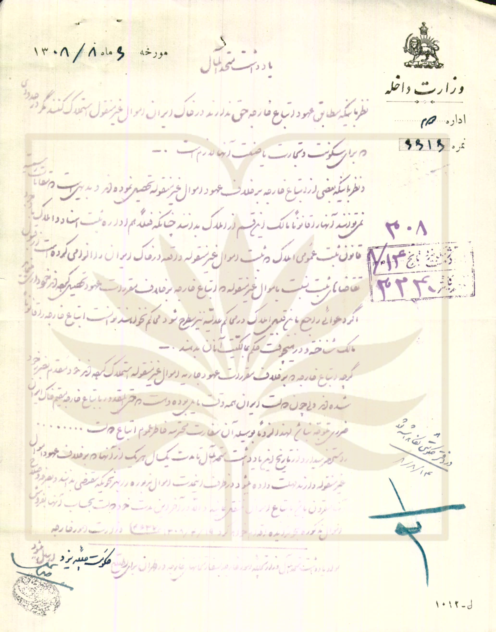 - عنوان سند : بخشنامه ی وزارت داخله، در باره ی ممنوع بودن مالكيت اموال غير منقول اتباع خارجی در خاك ايران
