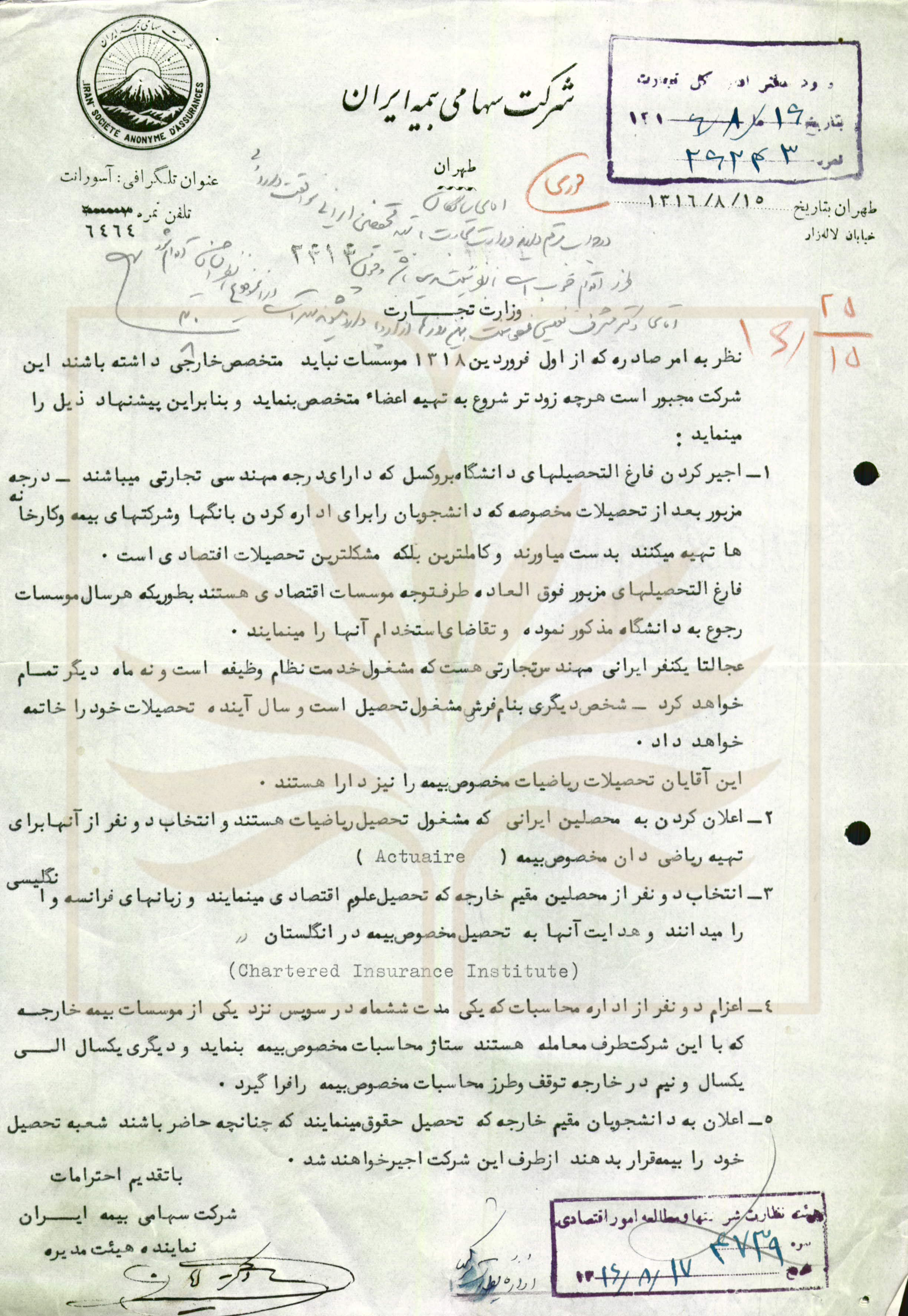 در این سند، شرکت سهامی بیمهی ایران، با توجه به دستور استفاده نکردن از متخصصان خارجی در مؤسسات و نياز خود به نيروی انسانی، پيشنهادهای زير را به وزارت تجارت اعلام كرده است.