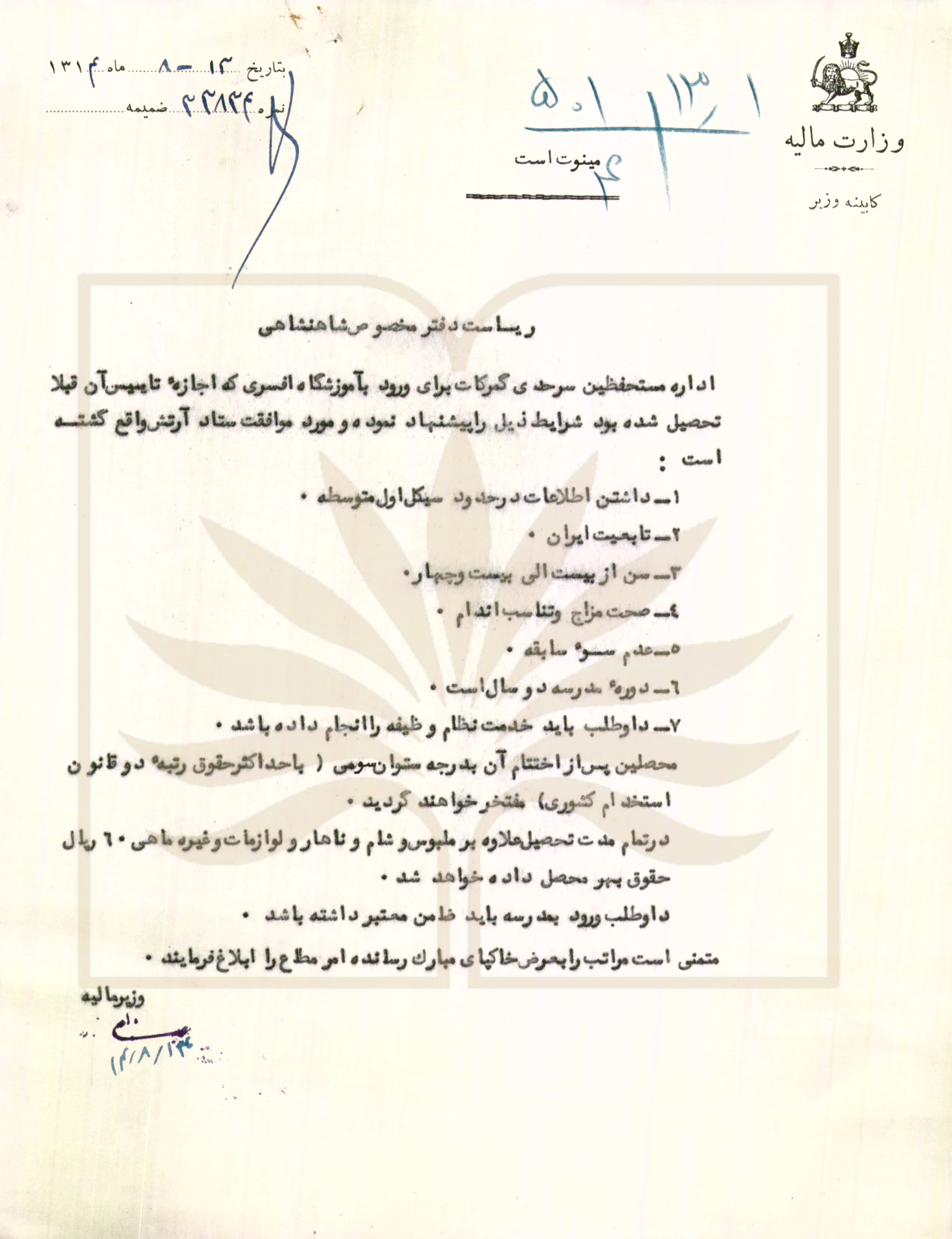 در این سند، وزارت مالیه، خبر موافقت ستاد ارتش را با شرایط 7 گانهی ادارهی مستحفظین سرحدی گمرکات برای ورود داوطلبان به آموزشگاه افسری، اعلام کرده است. این شرایط، شامل ميزان تحصيلات، شرايط سنی، عمومی و سلامتی علاقهمندان ورود به آموزشگاه افسری است.