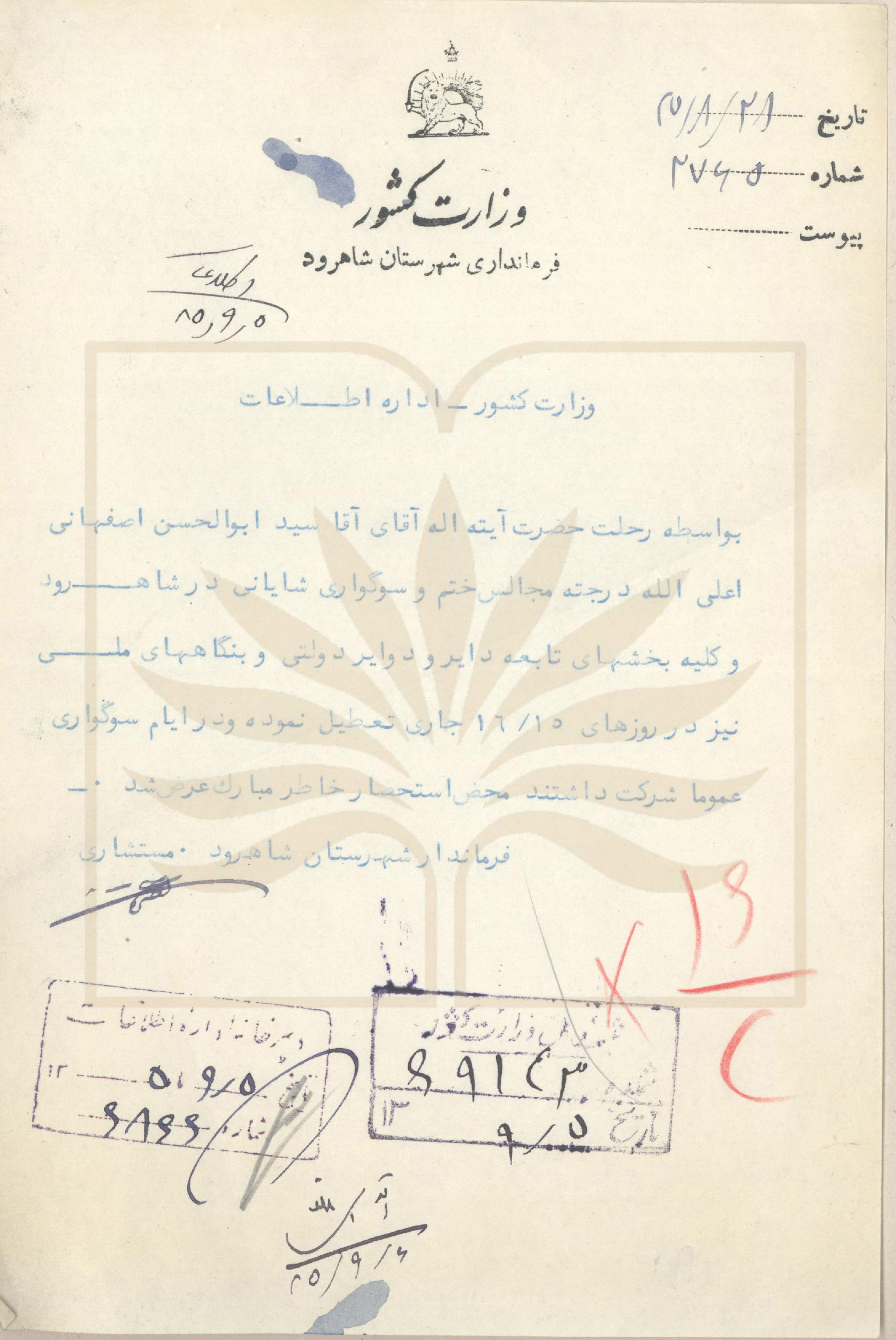 سند، حاوی گزارش فرمانداری شاهرود به وزارت كشور، در مورد برگزاری مراسم ختم آيتالله سيدابوالحسن اصفهانی و تعطيلی اداره های شهر به همين مناسبت است.