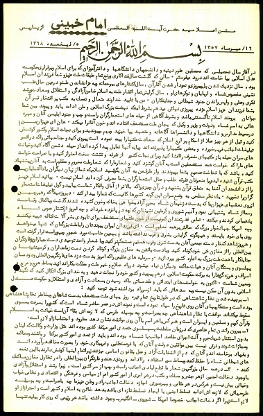 - عنوان سند : اعلامیه امام خمینی(رحمه الله علیه) خطاب به محصلان علوم دینی، دانشجویان و دانش آموزان در آغاز سال تحصیلی