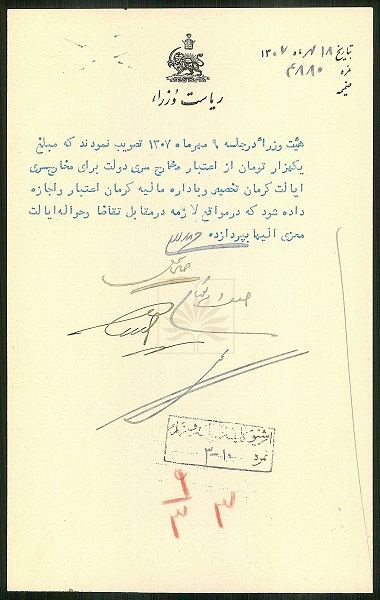 مصوبه هیئت وزراء با موضوع تخصیص یک هزار تومان از اعتبار مخارج سری دولت به ایالت کرمان برای استفاده در مواقع لازمه در قبال تقاضا و حواله آن ایالت نزد مالیه.