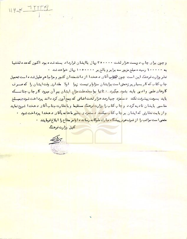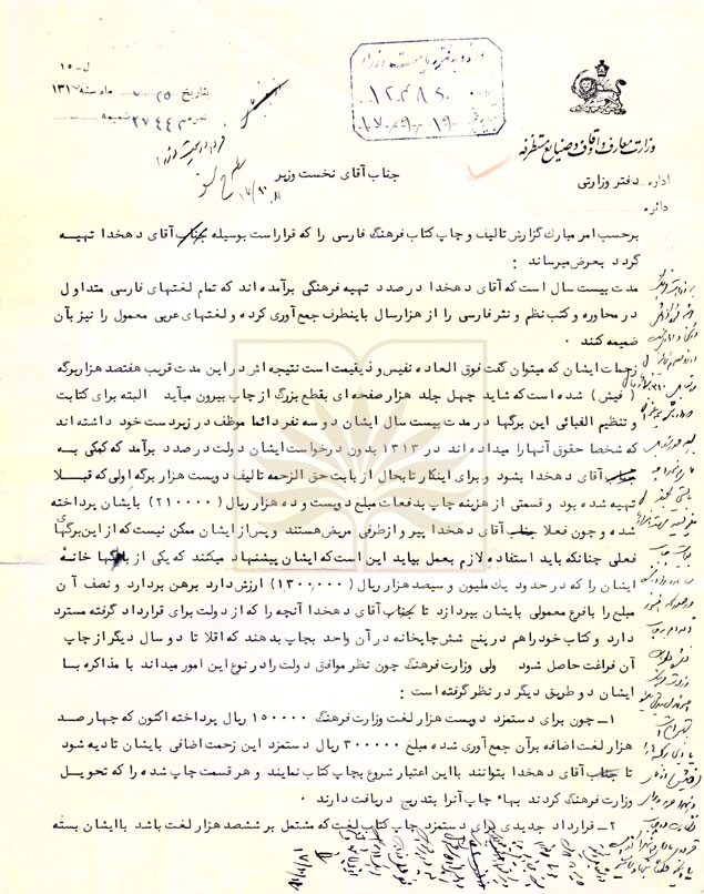 شرح سند: اين سند نامه کفیل وزارت فرهنگ به نخست وزیر است که در آن گزارشی در مورد تألیف و چاپ فرهنگ فارسی دهخدا و زحماتی که آقای دهخدا در مدت بیست سال با تهیه بیش از ششصد هزار لغت در افزون بر هفتصد هزارفیش کشیده اند و ناتوان شده داده و خواستار پرداخت حق الزحمه و ادامه کار لغتنامه توسط ایشان با حق الزحمه ماهانه شده است.