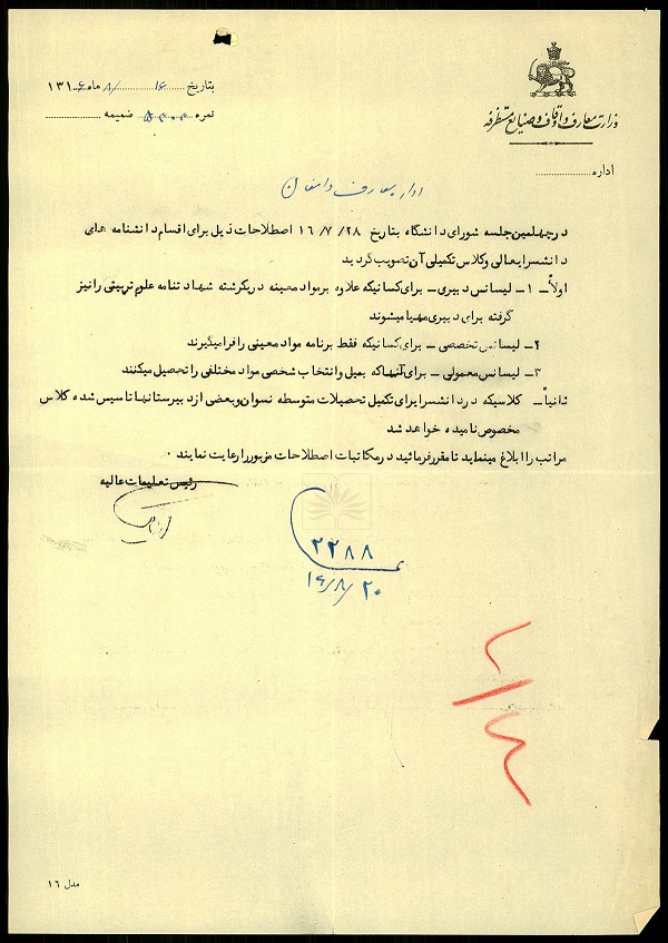 ابلاغ مصوبه شورای عالی دانشگاه به اداره معارف دامغان، در خصوص اصلاحات اقسام دانشنامه های دانشسرای عالی، کلاس تکمیلی و ملاک اعطای انواع لیسانس به فارغ التحصیلان.