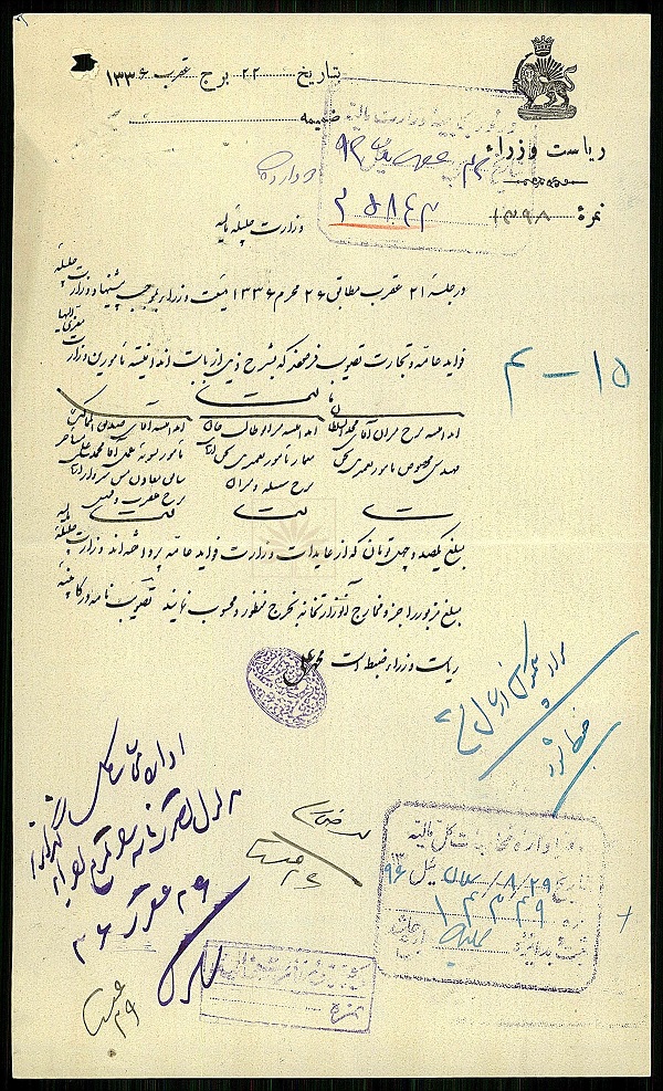 مصوبه هیئت وزیران؛ درخصوص موافقت با پیشنهاد وزارت فواید عامه و تجارت درخصوص مجاز بودن وزارت مالیه در پرداخت حقوق چند نفر از کارکنان خود از محل مخارج جاری وزارتخانه.