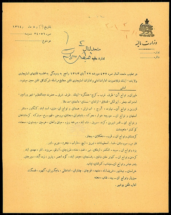 بخشنامه وزارت مالیه؛ درخصوص تعیین نوع امانی یا استیجاری بودن تلفن های اداره های مختلف کشور، لزوم دریافت صورت حساب فقط از اداره های اجاره ای و تأکید بر تصفیه حساب انواع امانی در مرکز.