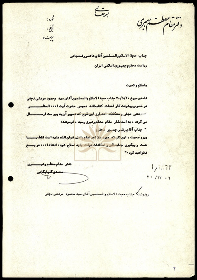 شرح سند: نامه ارسالی از دفتر مقام معظم رهبری به رئیس جمهور در خصوص برطرف کردن مشکلات اعتباری احداث کتابخانه آیت الله مرعشی نجفی و تأکید مقام معظم رهبری بر اصلاح امور با پیگیری رئیس جمهور و امکانات دولت به همراه متن نامه متولی و سرپرست کتابخانه درباره ارزش و اهمیت گنجینه کتابخانه، برنامه ها و هزینه های مورد نیاز.