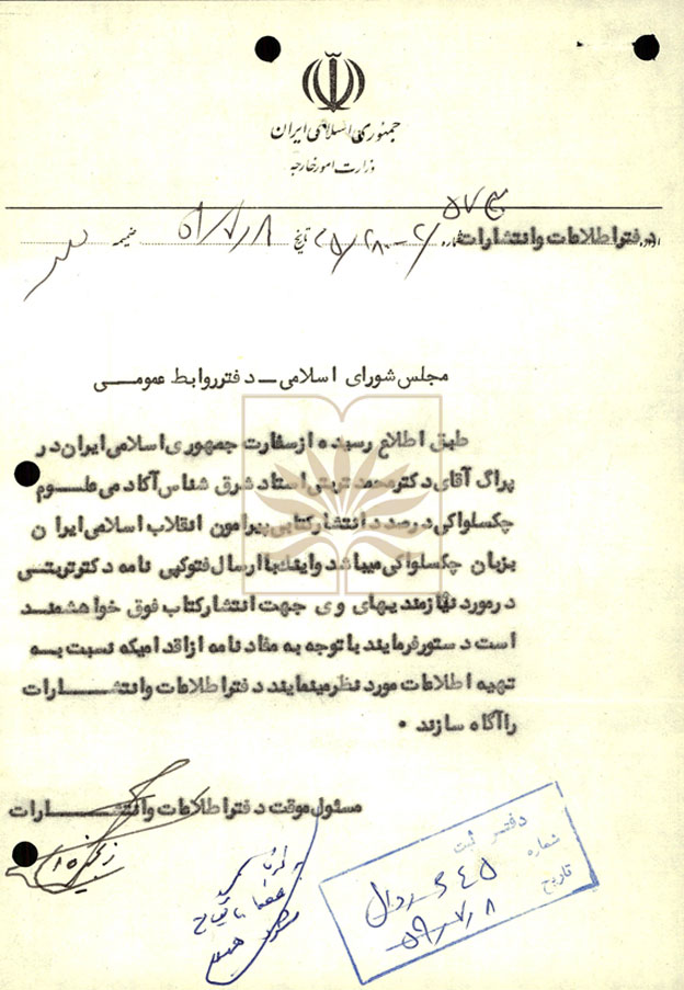 - عنوان سند : درخواست از دفتر روابط عمومی مجلس شورای اسلامی برای اعلام اقدامات انجام شده برای انتشار کتاب پیرامون انقلاب اسلامی ایران به زبان چکسلواکی