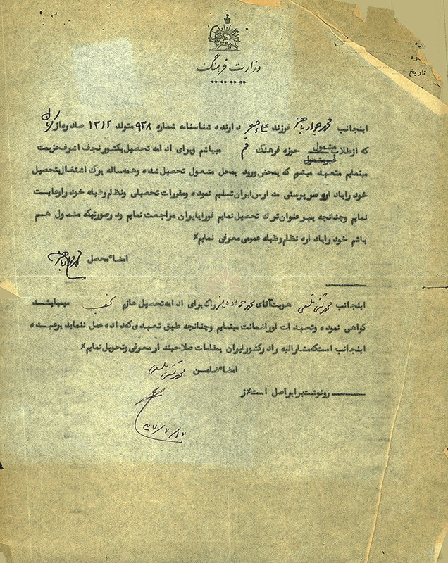 تعهدنامه [شهید حجت الاسلام] محمدجواد باهنر جهت تحصیل در حوزه علمیه نجف نسبت به رعایت مقررات تحصیلی و قانونی ایران با تأیید هویت ایشان از سوی [آیت الله]محمدتقی فلسفی به عنوان ضامن.