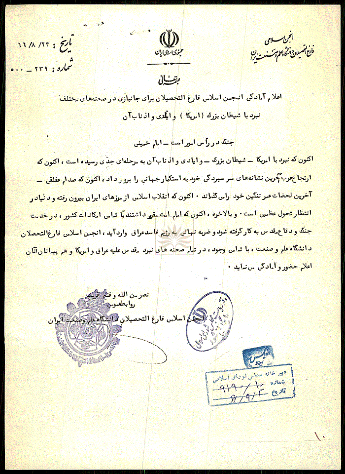 - عنوان سند : اعلام آمادگی انجمن اسلامی فارغ التحصیلان دانشگاه علم و صنعت برای حضور در جبهه ها
