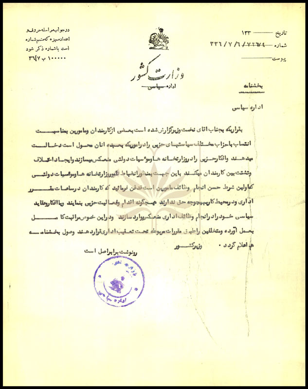 شرح سند : این سند بخشنامه وزارت کشور است و اشعار میدارد که به نخست وزیر گزارش شده کارمندان دولت افکار و سیاستهای حزبی خود را در امور محوله دخالت داده و این باعث اختلاف میان آنها و بهم خوردن انضباط کاری شده است و لازم است مقرر شود که کارمندان از فعالیت حزبی و انعکاس عقاید سیاسی در محیط کار خودداری کنند و متخلفان را طبق مقررات مربوط تحت تعقیب قرار دهند.