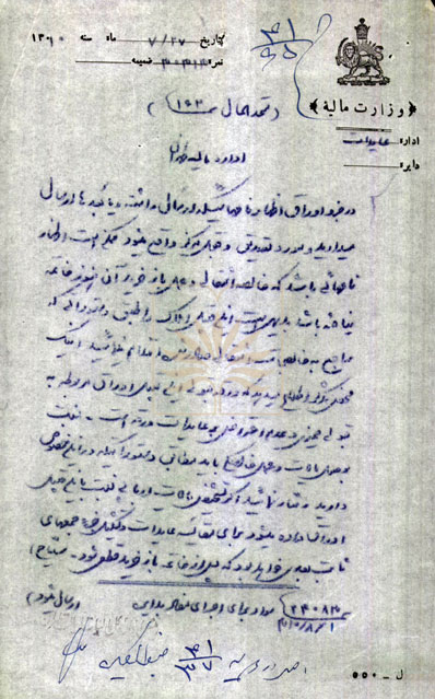 شرح سند : اين سند بخشنامه رئيس اداره کل ماليات ايالت تهران به اداره ماليه تهران است که در آن آمده نسبت به ارسال اظهارنامههايی که خالصه انتقالی و عمل بازخريد آنها هنوز خاتمه نيافته طبق دستورات مربوط به خالصجات انتقالی عمل شود.