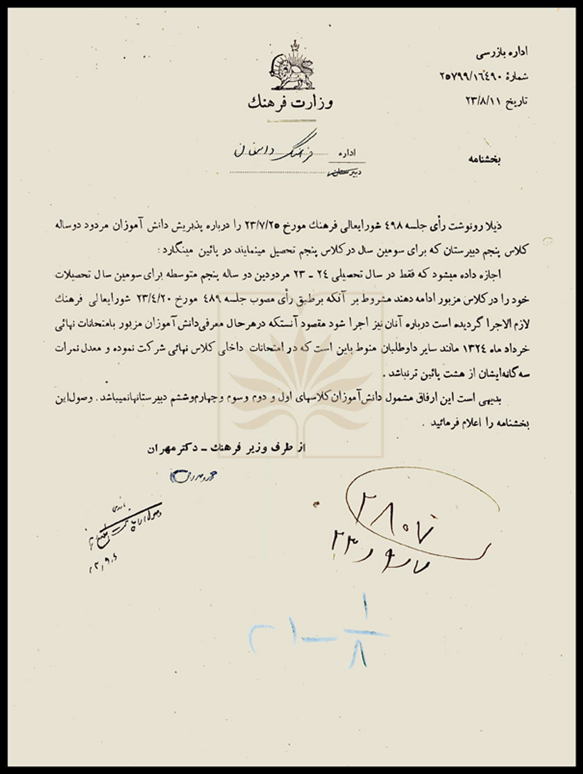 این سند بخشنامهای از طرف وزیر فرهنگ به اداره فرهنگ دامغان است که در آن آمده مطابق رأی شورایعالی فرهنگ به دانش آموزان مردود دوساله کلاس پنجم متوسطه در سال تحصیلی 23-24 برای سومین سال اجازه تحصیل داده میشود مشروط به این که در امتحانات داخلی معدل نمرات سه گانه آنها از هشت پائین تر نباشد.