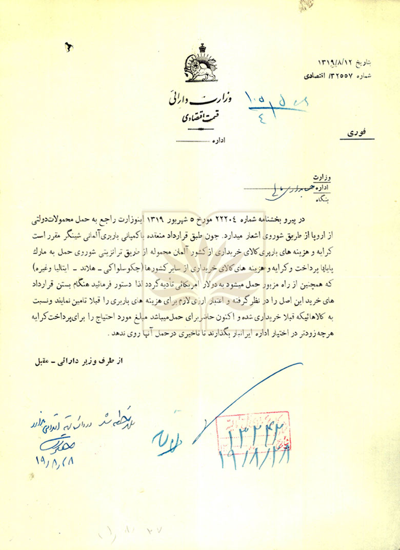 این سند نامهای از طرف وزیر دارائی به اداره حسابداری مالی این وزارتخانه است که در آن آمده پیرو بخشنامه وزارتی راجع به حمل محمولات دولتی از طریق شوروی طبق قرارداد با کمپانی آلمانی شینگر کرایه حمل کالاهای خریداری از آلمان پایاپا و به مارک و سایر کشورها به دلار محاسبه و به اداره ایرانبار پرداخت شود