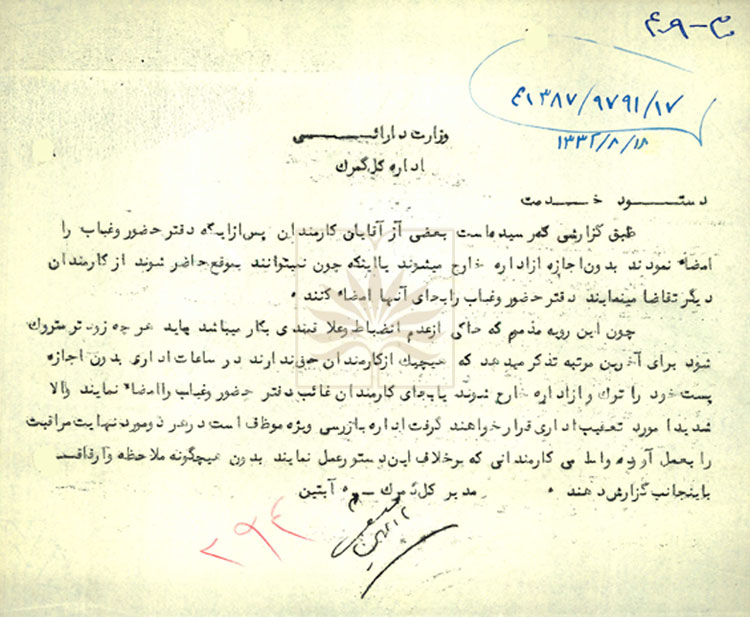 این سند تذکر مدیرکل گمرک به کارمندان آن اداره کل است که به خروج کارمندان از محل کار در ساعات اداری و امضای دیگران در هنگام خروج بجای آنان معترض شده و هشدار داده است.