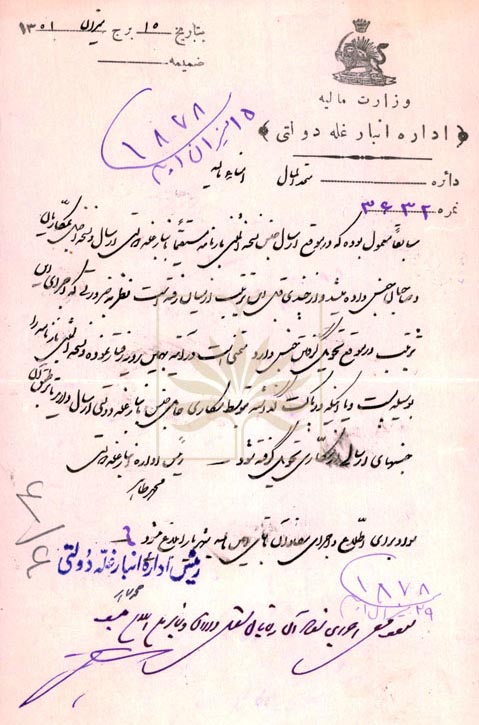 شرح سند: اين سند بخشنامه رئیس اداره انبار غله دولتی به امناء مالیه است. مبنی بر این که در گذشته در ارسال جنس نسخه المثنی بارنامه به اداره غله و نسخه اصل به مکاریان حامل جنس داده می شد. اما، مدتی است این ترتیب رعایت نمی شود. این بخشنامه خواستار برگشت رویه گذشته است.