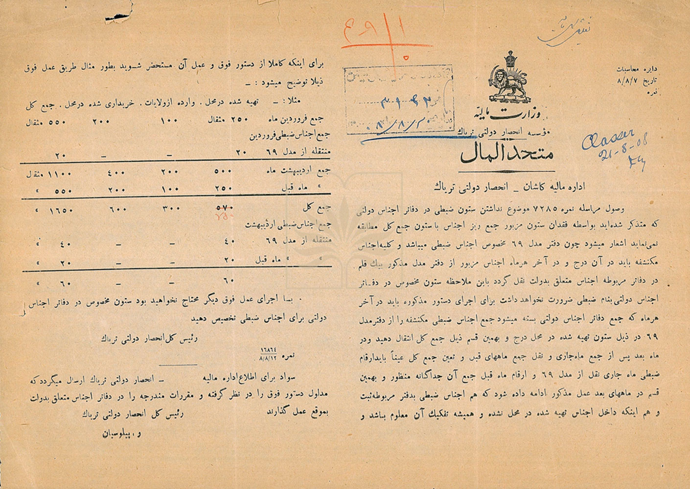 شرح سند: اين سند بخشنامه رئیس کل انحصار دولتی تریاک به اداره مالیه کاشان است که در آن نحوه انتقال اطلاعات اجناس کشف شده از دفتر مدل 69 مخصوص اجناس ضبطی به دفاتر اجناس دولتی بدون نیاز به ایجاد ستون مخصوص را بیان کرده است به نحوی که ارقام هر ماه و همچنین جمع ماه ها به تفکیک درج شود.
