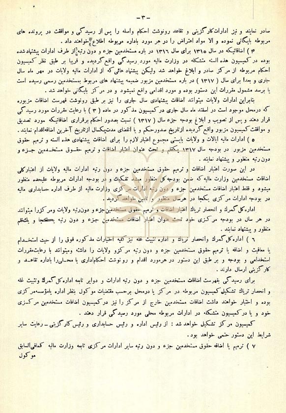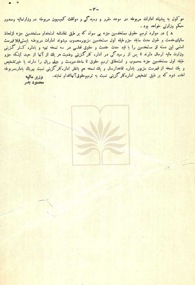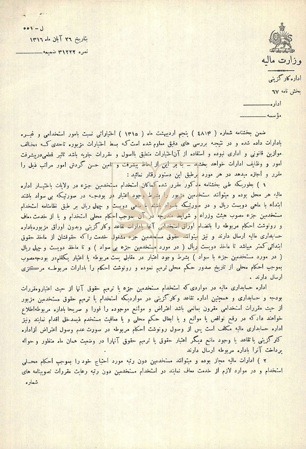 شرح سند: اين سند بخشنامه وزیر مالیه به کارگزینی این وزارت درباره استخدام و ترمیم حقوق مستخدمان جزء ادارات مالیه است و طبق اختیاراتی که به ادارات داده شده آن ها می توانند برای پیشرفت امور و حسن گردش کار ادارات و در صورت وجود اعتبار مستخدمان جزء بی سواد یا باسواد را هر یک با رقم مشخص در این بخشنامه استخدام و یا به ترمیم حقوق آن ها اقدام و در صورت لزوم از خدمت معاف نمایند.