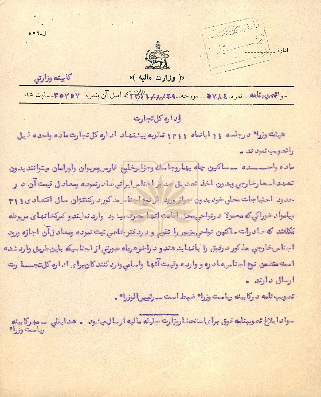 شرح سند: اين سند سواد نامه رئیس وزراء به اداره کل تجارت وزارت مالیه است که در دفتر وزارتی به ثبت رسیده و متن تصویب نامه هیئت وزراء در 11آبان را در بر دارد. هیئت وزراء طبق یک ماده واحده به ساکنان چاه بهار و جاسک و جزایر خلیج فارس اجازه داده تا بدون تعهد ارز خارجی و بدون اخذ تصدیق صادرات و در حد احتیاحات محلی واردات نمایند و گمرک خانه های آن نواحی را مکلف نموده که صادرات ساکنان را ثبت و معادل آن اجازه ورود اجناس خارجی بدهند و در پایان هرماه صورت واردات و صادرات را برای اداره کل تجارت ارسال دارند.