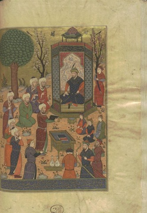 نگاره اهدای شاهنامه به بایسنغر میرزا در قصر سفید هرات در سال 833 ق.