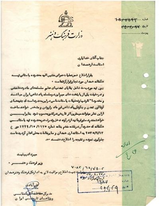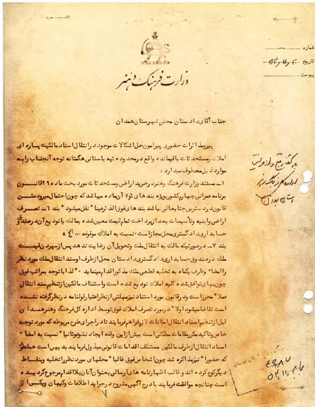 در پی بررسی و ارشیابی اوراق بایگانی راکد اداره کل میراث فرهنگی، گردشگری و صنایع دستی استان همدان توسط مدیریت اسناد و کتابخانه ملی منطقه غرب کشور، اسناد و مکاتبات مربوط به تملک اراضی و ساختمان های مسکونی و تجاری واقع در حریم تپه هگمتانه کشف و پس از انتقال در آرشیو ملی ایران ثبت شد.
