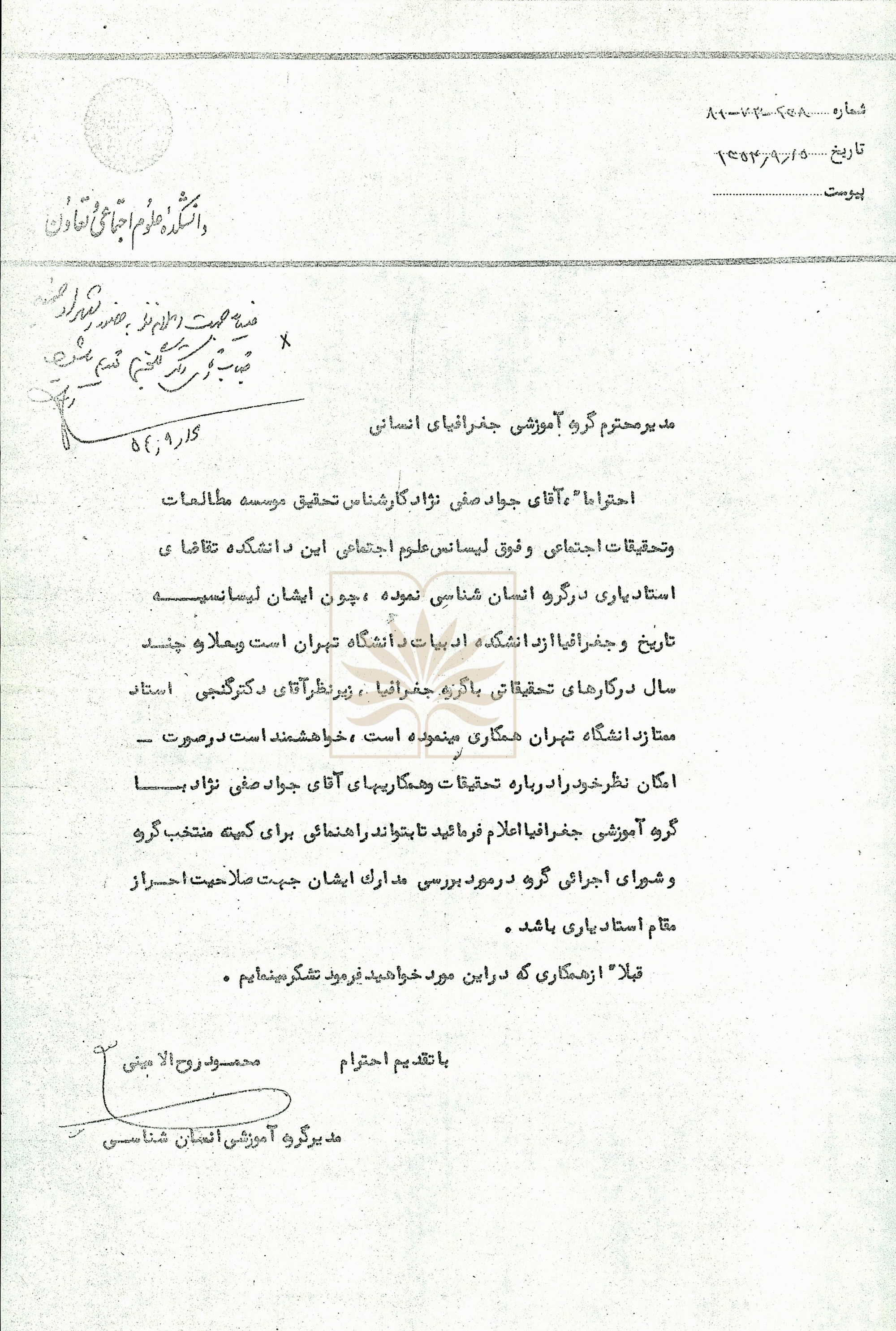 در سند معرفیشده، مکاتبه رئیس گروه آموزشی انسانشناسی دانشکده علوم اجتماعی و تعاون دانشگاه تهران با مدیر گروه آموزشی جغرافیای انسانی درباره تقاضای صفینژاد برای احراز مرتبه استادیاری و درخواست اعلام نظر جهت طرح موضوع در کمیته گروه و شورای اجرایی آن منعکس شده است. این نامه برای اظهارنظر تخصصی به محمدحسن گنجی ارجاع میشود.