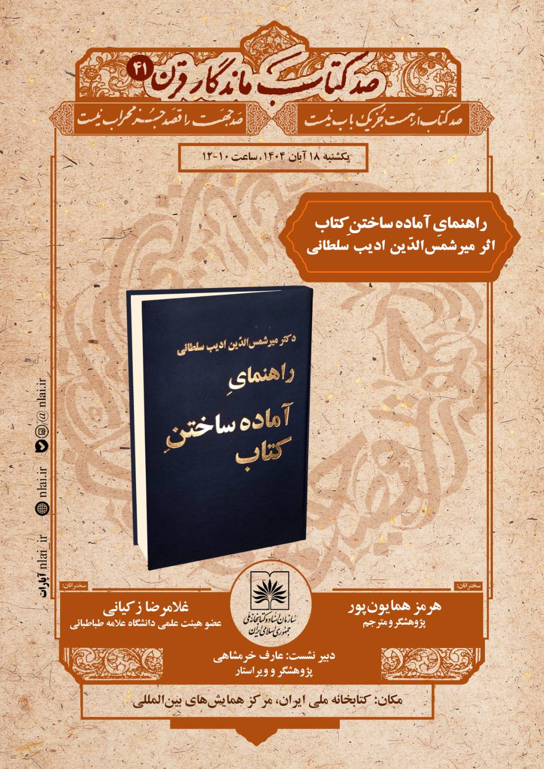 چهلویکمین نشست از مجموعهبرنامههای «صد کتاب ماندگار قرن» روز یکشنبه ۱۸ آبانماه ۱۴۰۴ از ساعت ۱۰ تا ۱۲ در مرکز همایشهای بینالمللی کتابخانه ملی ایران برگزار میشود و به بررسی کتاب «راهنمای آماده ساختن کتاب» اثر زندهیاد میرشمسالدین ادیبسلطانی اختصاص دارد.