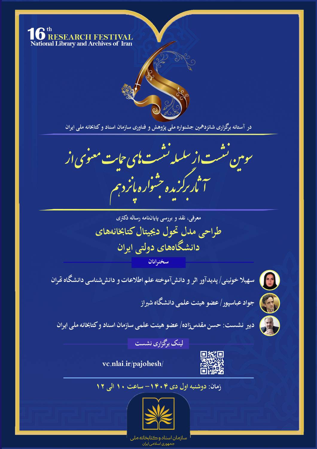 به گزارش روابط‌عمومی سازمان اسناد و کتابخانه ملی ایران، این نشست، به معرفی، نقد و بررسی رساله دکتری با عنوان «طراحی مدل تحول دیجیتال کتابخانه‌های دانشگاه‌های دولتی ایران» اختصاص دارد.