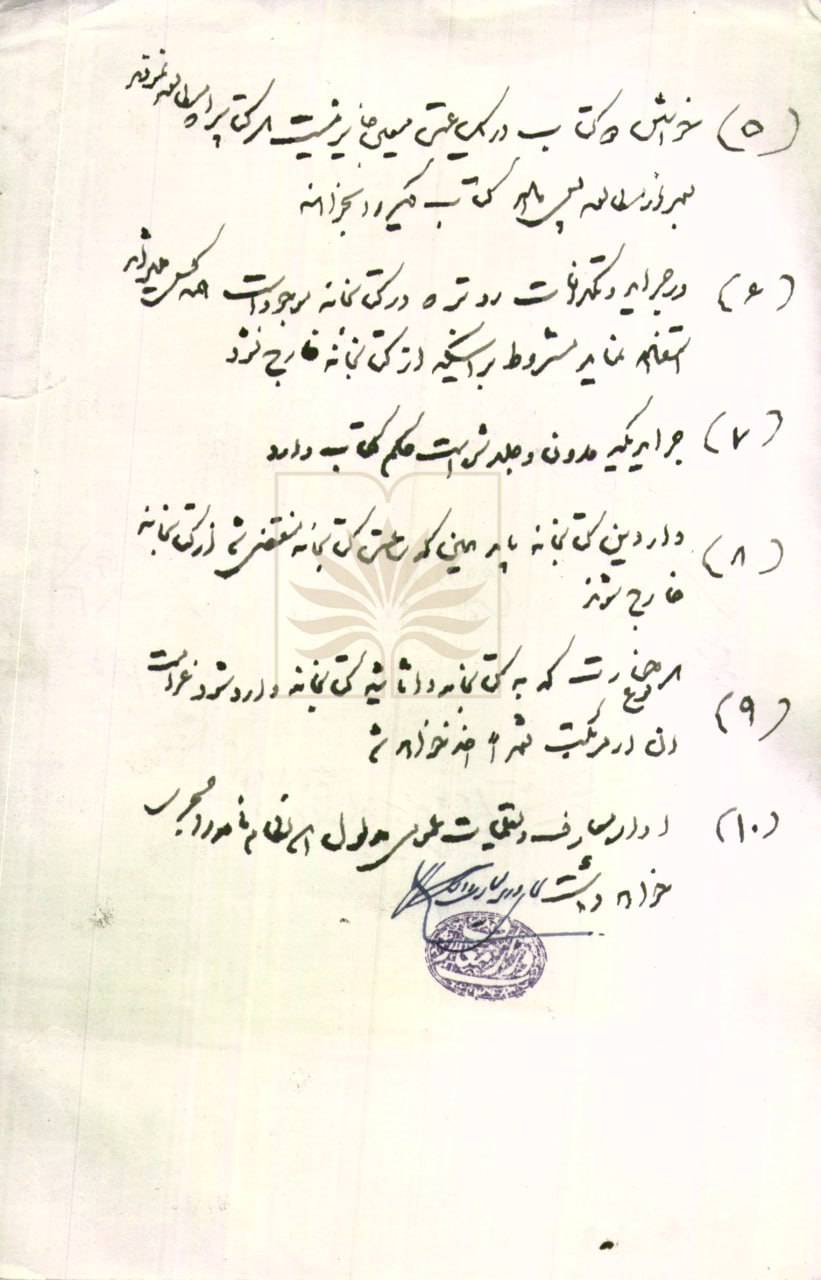 در پایان سند، مهر و امضای مقام مسئول وقت دیده می‌شود که نشان‌دهندۀ توجه دستگاه معارف به جایگاه کتاب و نقش کتابخانه در زندگی فرهنگی جامعه است. این سند با شماره ثبت ۳۶۴۶۳–۲۹۷ در آرشیو ملی ایران نگهداری می‌شود.