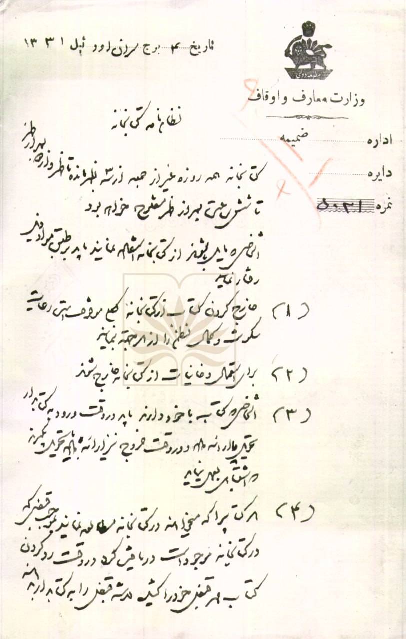سند تازه ارائه‌شده در این شماره، گوشه‌ای از نخستین تلاش‌های اداری ایران برای تنظیم مقررات کتابخانه‌های عمومی در سال‌های پایانی دورۀ قاجار را نشان می‌دهد.