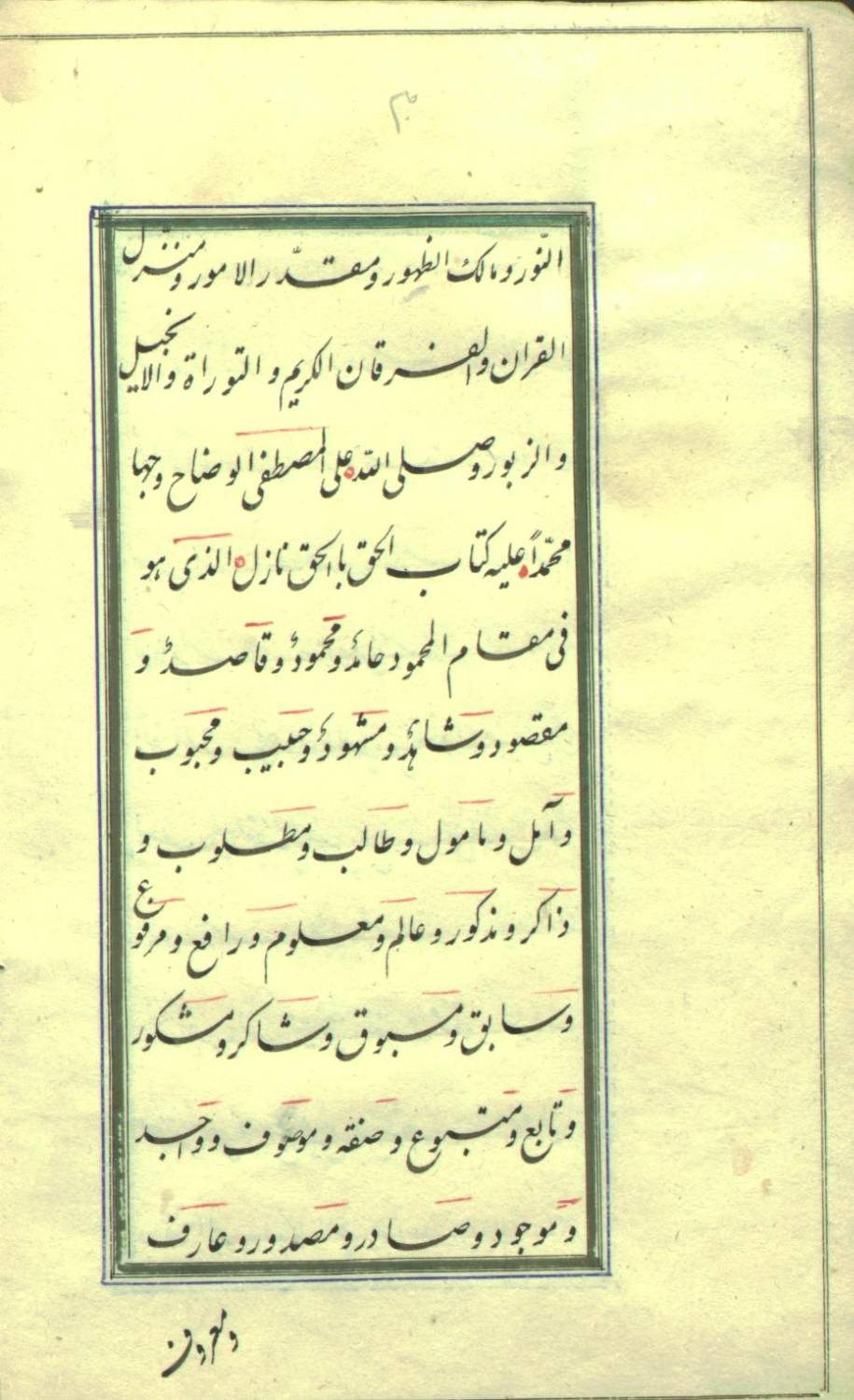 این نسخه به خط نستعلیق، جدولدار و تزیینشده با مرکب قرمز است و جلد آن از نوع تیماج قهوهای با آستر آبی است. کیفیت کتابت، ساختار محتوایی و تزیینات نسخه، ارزش هنری و نسخهشناختی آن را دوچندان کرده است.