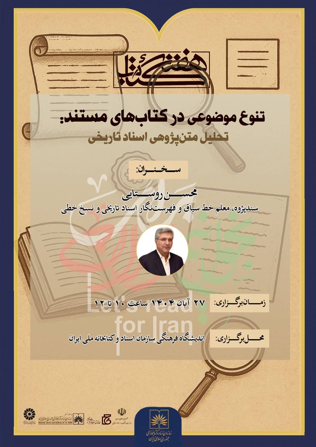 نشست «تنوع موضوعی در کتابهای مستند» روز ۲۷ آبان در اندیشگاه فرهنگی سازمان اسناد و کتابخانه ملی ایران با سخنرانی محسن روستایی برگزار میشود.