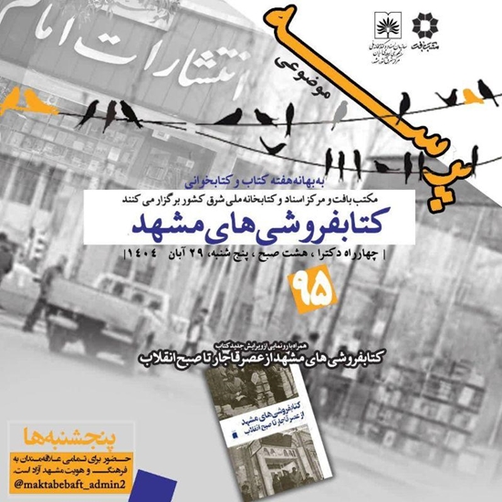 به بهانه هفته کتاب و کتابخوانی مکتب بافت و مرکز اسناد و کتابخانه ملی منطقه شرق کشور، نود و پنجمین پرسه‌ی موضوعی بافت را به منظور بازدید از کتابفروشی های مشهد برگزار می نمایند.