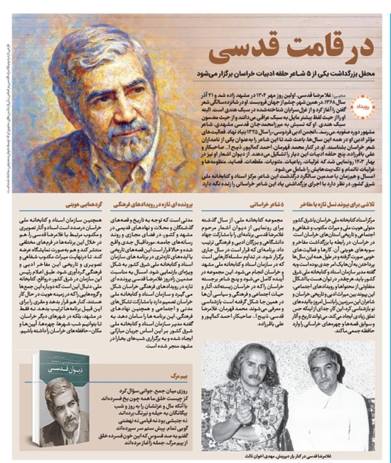 غلامرضا قدسی، اولین روز مهر ۱۳۰۴ در مشهد زاده شد و ۲۱ آذر سال ۱۳۶۸، در همین شهر، چشم از جهان فروبست. او در شانزده‌سالگی شعر گفتن را آغاز کرد و از غزل‌سرایان شناخته‌شده در سبک هندی است. البته او را از حیث لفظ بیشتر مایل به سبک عراقی می‌دانند و از حیث مضمون سبک هندی. او که نسبش به میرزامحمدجان قدسی مشهدی، شاعر مشهور دوره صفویه، می‌رسد، «انجمن ادبی فردوسی» را سال ۱۳۲۵ بنیاد نهاد. فعالیت‌های مؤثر ادبی او در همه این سال‌ها، باعث شد تا این شاعر را به‌عنوان یکی از نامداران شعر خراسان بشناسند. او، در کنار محمد قهرمان، احمد کمالپور، ذبیح ا... صاحبکار و علی باقرزاده، پنج حلقه ادبیات این دیار را تشکیل می‌دهند. از دیوان اشعار او نیز در بهار ۱۴۰۳ رونمایی شد که غزلیات، رباعیات، مثنویات، مقطعات، قصاید، منظومه‌ها و غزلیات ناتمام و تک‌بیت‌هایش را شامل می‌شود. امسال و هم‌زمان با صدمین سالگرد درگذشت این شاعر، مرکز اسناد و کتابخانه ملی شرق کشور، در نظر دارد با اجرای بزرگداشتی یاد این شاعر خراسانی را زنده نگه دارد.