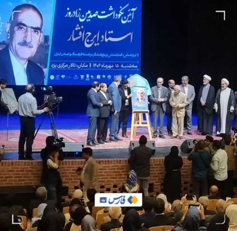 آیین نکوداشت یکصدمین زادروز استاد ایرج افشار در یزد آیین باشکوه نکوداشت یکصدمین زادروز استاد «ایرج افشار» پدر کتاب‌شناسی ایران، با حضور جمعی از ایران‌شناسان، پژوهشگران و اندیشمندان از سراسر کشور در تالار مرکزی یزد برگزار شد.