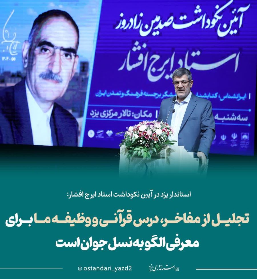 -استاندار یزد در آیین نکوداشت استاد ایرج افشار: تجلیل از مفاخر، درس قرآنی و وظیفه ما برای معرفی الگو به نسل جوان است استاندار یزد در آیین نکوداشت صدمین زادروز استاد ایرج افشار، با تأکید بر اینکه قدرشناسی از انسان‌های فرهیخته یک درس الهی است، گفت: استاد افشار به تنهایی کار صدها دانشمند را انجام داد و اگر حضرت ابراهیم (ع) به تنهایی یک امت بود، این پژوهشگر برجسته نیز با خلق بیش از ۳۰۰ کتاب و ۳۰۰۰ مقاله، یک امت در عرصه فرهنگ و دانش بود.