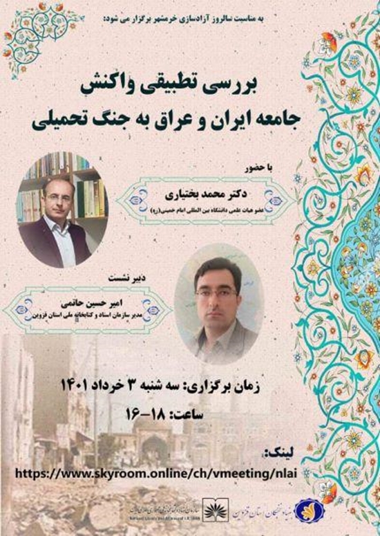 وبینار تخصصی "تبیین و بررسی تطبیقی واکنش جامعه ایران و عراق به جنگ تحمیلی" به مناسبت سالروز آزادسازی خرمشهر در فضای اسکای روم برگزار می شود.