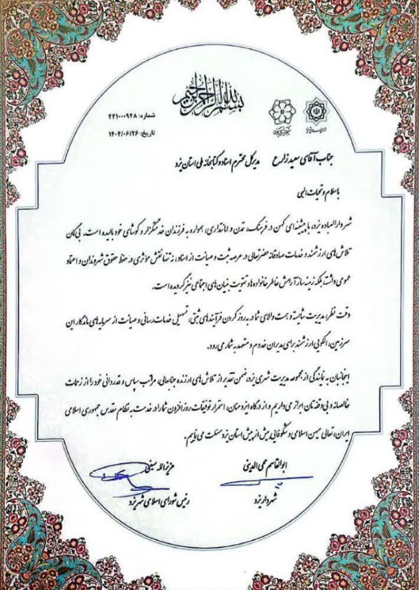به گزارش روابط عمومی سازمان اسناد و کتابخانه ملی استان یزد سعید زارع روز چهارشنبه در دویست و شصت و چهارمین جلسه علنی شورای اسلامی شهر یزد، افزود: بخش قابل توجهی از شهروندان استان محقق برجسته‌ای مانند مرحوم ایرج افشار یزدی را نمی‌شناسند در حالیکه اسم ایشان با ایران شناسی عجین شده و پدر نسخه شناسی ایران است. وی ادامه داد: از شورای شهر و شهرداری انتظار می رود، با معرفی بزرگانی مانند استاد ایرج افشار در قالب تابلوهای شهری شهروندان به خصوص نسل جوان را با این گونه مفاخر بیشتر آشنا کنند. در این جلسه سیفی رییس شورای اسلامی شهر یزد با تلکید بر حمایت این شورا و کمیسیون فرهنگی از برگزاری چنین رویدادهایی در یزد و درخواست ارسال لوایح چند فوریتی فرهنگی از سازمان اسناد و کتابخانه ملی استان به شورا در خصوص برنامه های ارزشمند این سازمان در عرصه ی تحول فرهنگی استان نیز در این جلسه علنی گفت: ستاد مهر در شهرداری تشکیل شده و اقدامات خوبی با تاکید اعضای شورای اسلامی شهر برای آماده سازی مدارس در دستور کار قرار گرفته و اجرا شده است. گفتنی است در پایان این جلسه لوح تقدیری با امضای شهردار و رئیس شورای شهر به مدیر کل اسناد و کتابخانه ملی استان تقدیم شد.